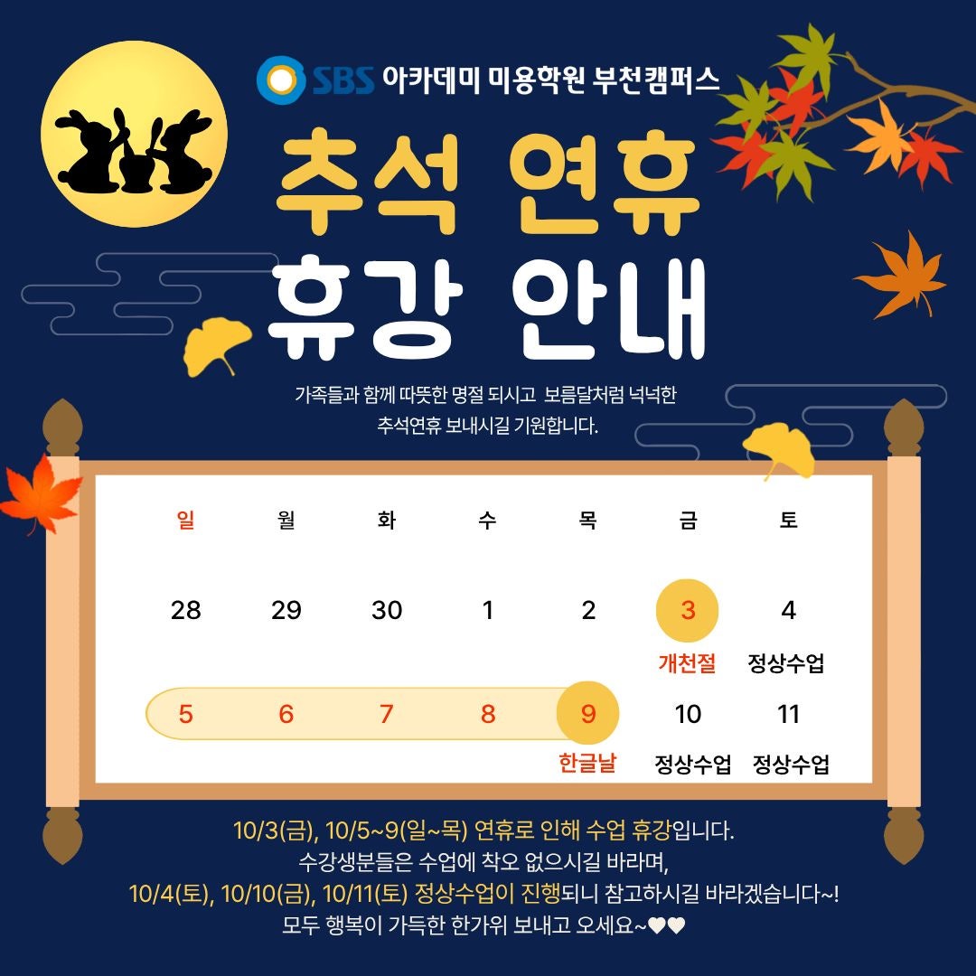 👉10/3(±Ý), 10/5(ÀÏ)~10/9(¸ñ)¿äÀÏÀº ¼ö¾÷ ÈÞ°ÀÌ¿À´Ï